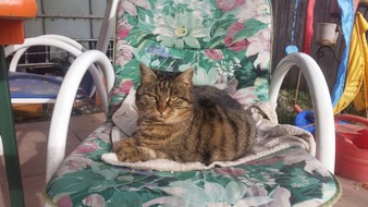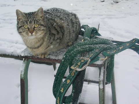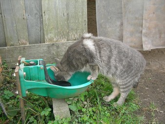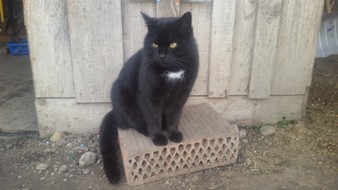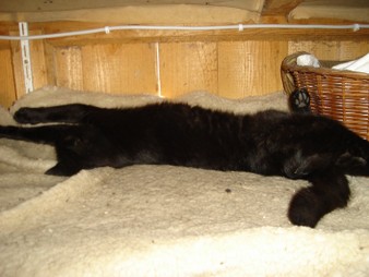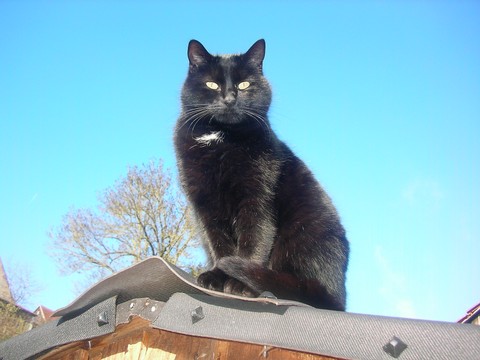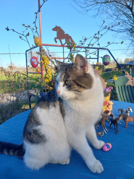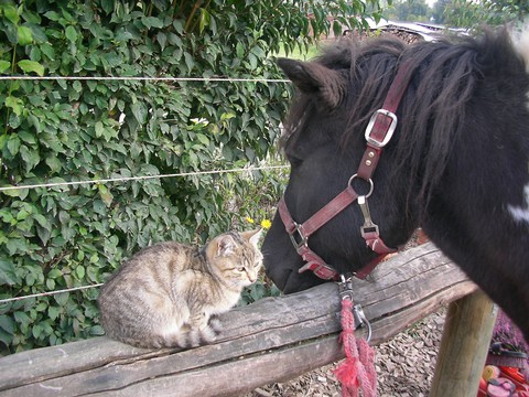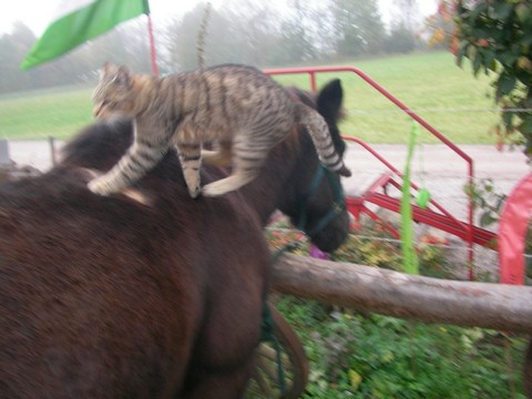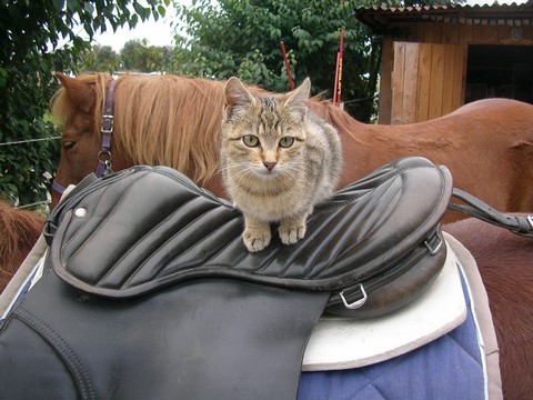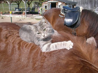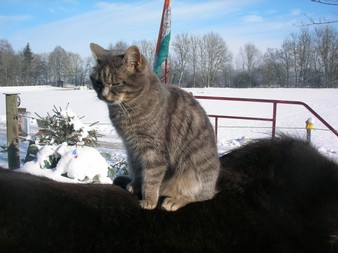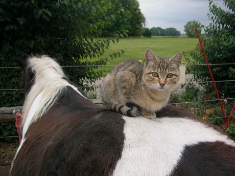 Ich, Mysla, der Ältere, bin natürlich der Chefkater auf dem Hof! Ich beobachte alles sehr genau, heiße alle Menschen herzlich willkommen und ich passe ganz arg auf, dass alles in Ordung ist. Mein Markenzeichen ist mein Knickohr. Außerdem fehlt mir ein Eckzahn (ich hab mal ein Eichhörnchen gejagt... das war wohl doch etwas zäh...). Als ich noch jünger war, hab ich das Reiten für mich entdeckt, ich muß schon sagen: super Sache! Inzwischen bin ich ja schon etwas älter und überlasse das reiten mehr der Mausi....