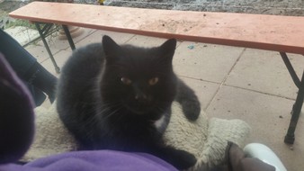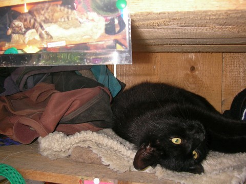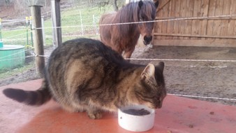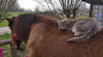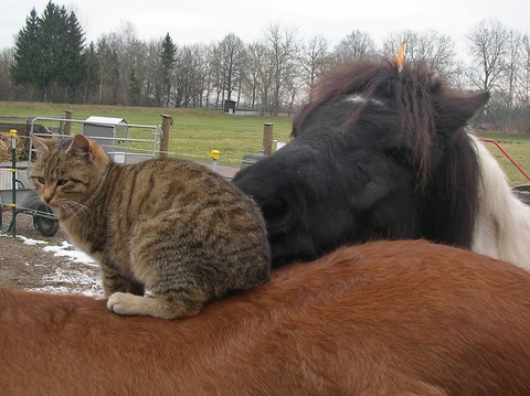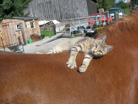 Er hat mich so in meinen Aufgaben unterstützt, wenn Kinder schüchtern und unsicher waren, machte er einen seiner lustigen Gags und alle mußten lachen, das Eis war gebrochen. Er hat sich selber das Reiten beigebracht (nicht zur Freude aller Pferde…) und das Beste war, als er von einem Pferd auf das andere sprang, ich setzte dem ganzen noch die Krone drauf und holte einen Reifen….das war dann doch sensationell, er sprang durch diesen, von einem Pferderücken auf den andern…ja, der Pferdehof war sein Leben, er passte auf, mit Leib und Seele, er begrüßte alle Menschen, die kamen, und wenn ein Hund draußen unerlaubt vorbeimarschierte, ginge er ihm nach, den ein oder anderen hat er auch vertrieben, er war so ein mutiger kleiner Kater! Ja, als er langsam dement wurde, sorgten wir noch mehr für ihn, wir setzen ihn auf unseren Schoß, weil er sonst das Fressen vergas, wir leihten uns einen Hasenkäfig aus, um ihn bei Hochbetrieb vor den Pferdehufen zu schützen, er konnte Gefahr nicht mehr erkennen. Wir kauften ein isoliertes Katzenhaus….in das er natürlich nicht rein ging…und irgendwo einsperren durfte man ihn gar nicht….Er ist schließlich bei uns im Gartenhaus friedlich eingeschlafen, unsere Trauer ist unendlich! Sein Halbbruder Mikesch ist ebenfalls untröstlich, die beiden waren ein Herz und eine Seele, all die Jahre verbrachten sie viel Zeit zusammen, waren abends auf dem Gartenhaus und genossen die Abendstimmung, gingen zusammen mausen, und zum Schluß versuchte Mikesch noch, ihm zu helfen, zeigte ihm das Futter, überwand dabei seine Angst vor unseren „wilden“ andern Katzen….ja, und verschand dann erst mal, als Mysla starb. Aber jetzt ist er wieder da, kommt regelmäßig,das Leben muß ja weiter gehen.