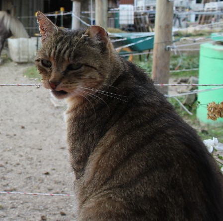 Ich, Mysla, der Ältere, bin natürlich der Chefkater auf dem Hof! Ich beobachte alles sehr genau, heiße alle Menschen herzlich willkommen und ich passe ganz arg auf, dass alles in Ordung ist. Mein Markenzeichen ist mein Knickohr. Außerdem fehlt mir ein Eckzahn (ich hab mal ein Eichhörnchen gejagt... das war wohl doch etwas zäh...). Als ich noch jünger war, hab ich das Reiten für mich entdeckt, ich muß schon sagen: super Sache! Inzwischen bin ich ja schon etwas älter und überlasse das reiten mehr der Mausi....